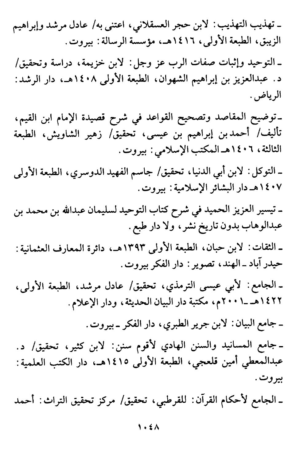 - تيسير العزيز الحميد في شرح كتاب التوحيد لسليمان عبد اللَّه بن محمد بن عبد الوهاب بدون تاريخ نشر، ولا دار طبع.