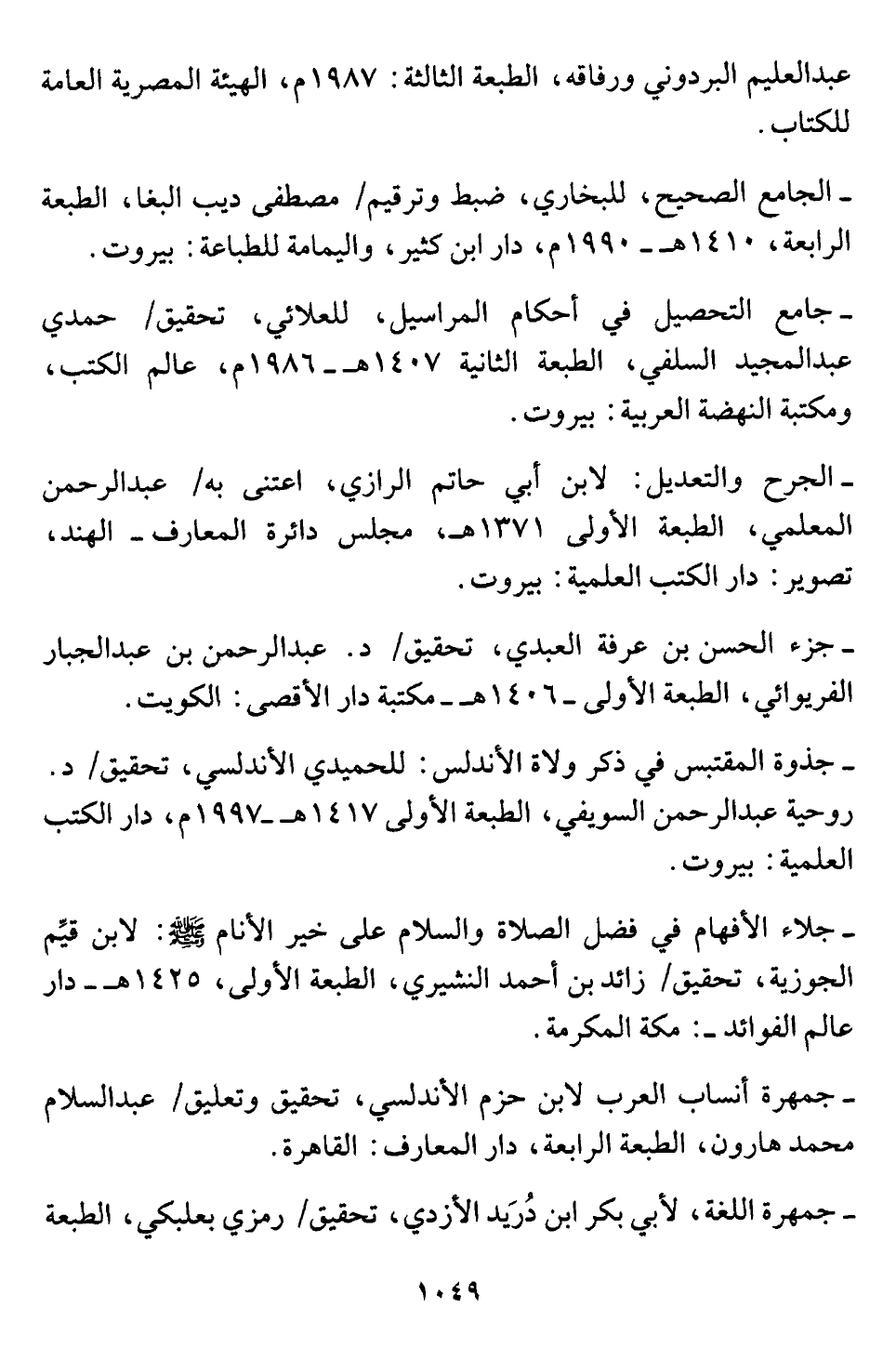 - جامع التحصيل في أحكام المراسيل، للعلائي، تحقيق/ حمدي عبد المجيد السلفي، الطبعة الثانية ١٤٠٧ هـ - ١٩٨٦ م، عالم الكتب، ومكتبة النهضة العربية: بيروت.