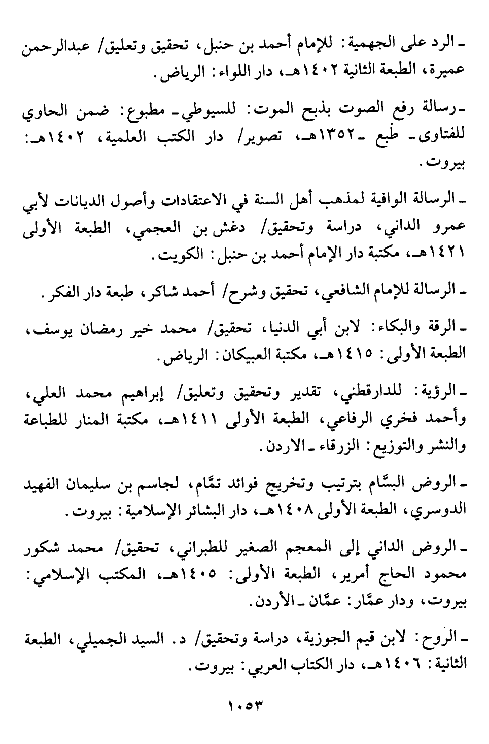 - الرسالة الوافية لمذهب أهل السنة في الاعتقادات وأصول الديانات لأبي عمرو الداني، دراسة وتحقيق/ دغش بن العجمي، الطبعة الأولى ١٤٢١ هـ، مكتبة دار الإمام أحمد بن حنبل: الكويت.