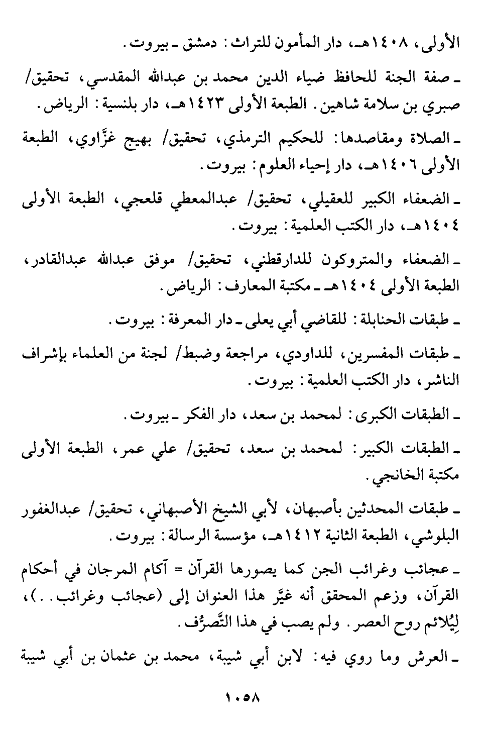 - صفة الجنة للحافظ ضياء الدين محمد بن عبد اللَّه المقدسي، تحقيق/ صبري بن سلامة شاهين. الطبعة الأولى ١٤٢٣ هـ، دار بلنسية: الرياض.