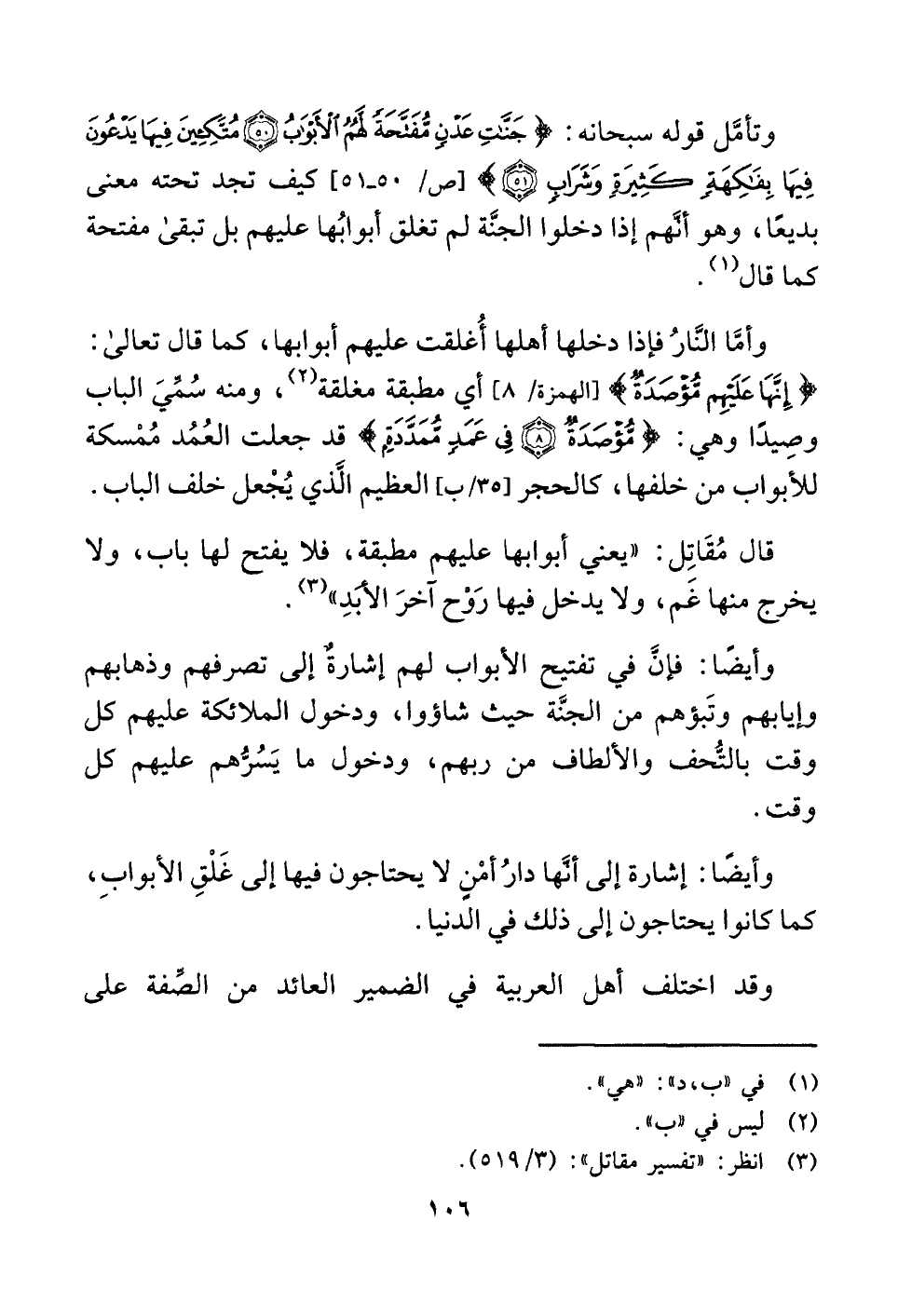 وتأمَّل قوله سبحانه: {جَنَّاتِ عَدْنٍ مُفَتَّحَةً لَهُمُ الْأَبْوَابُ (٥٠) مُتَّكِئِينَ فِيهَا يَدْعُونَ فِيهَا بِفَاكِهَةٍ كَثِيرَةٍ وَشَرَابٍ (٥١) } [ص: ٥٠ - ٥١] كيف تجد تحته معنى بديعًا، وهو أنَّهم إذا دخلوا الجنَّة لم تغلق أبوابُها عليهم بل تبقى مفتحة كما قال (¬١) .
