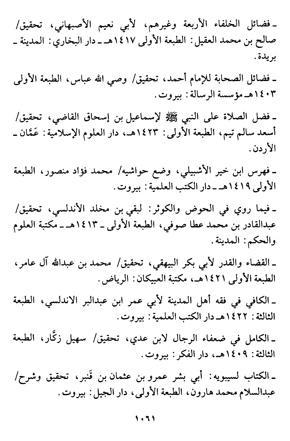 - فضائل الخلفاء الأربعة وغيرهم، لأبي نعيم الأصبهاني، تحقيق/ صالح بن محمد العقيل: الطبعة الأولى ١٤١٧ هـ - دار البخاري: المدينة - بريدة.