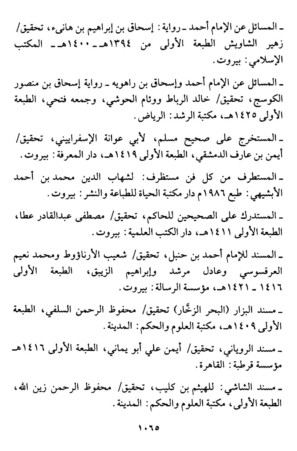 - مسند الشاشي: للهيثم بن كليب، تحقيق/ محفوظ الرحمن زين اللَّه، الطبعة الأولى، مكتبة العلوم والحكم: المدينة.