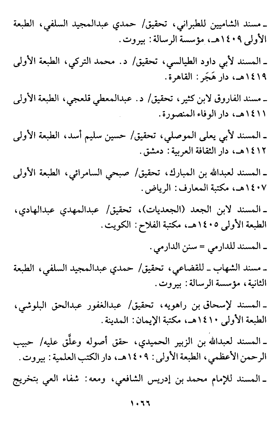 - المسند لعبد اللَّه بن الزبير الحميدي، حقق أصوله وعلَّق عليه/ حبيب الرحمن الأعظمي، الطبعة الأولى: ١٤٠٩ هـ، دار الكتب العلمية: بيروت.