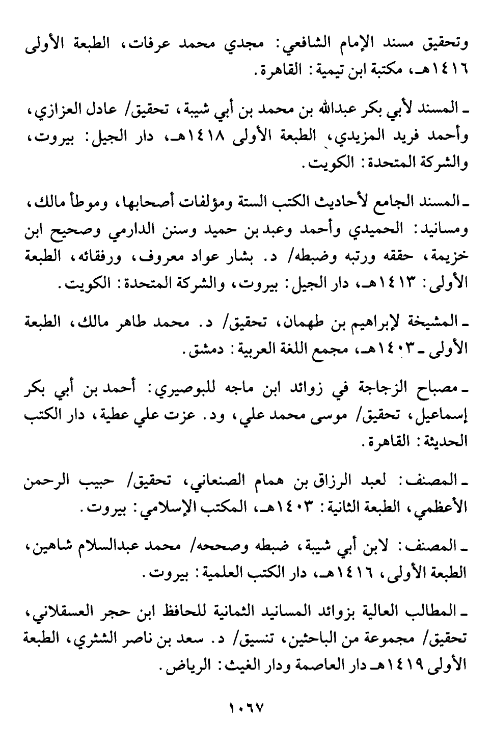 - المطالب العالية بزوائد المسانيد الثمانية للحافظ ابن حجر العسقلاني، تحقيق/ مجموعة من الباحثين، تنسيق/ د. سعد بن ناصر الشثري، الطبعة الأولى ١٤١٩ هـ دار العاصمة ودار الغيث: الرياض.