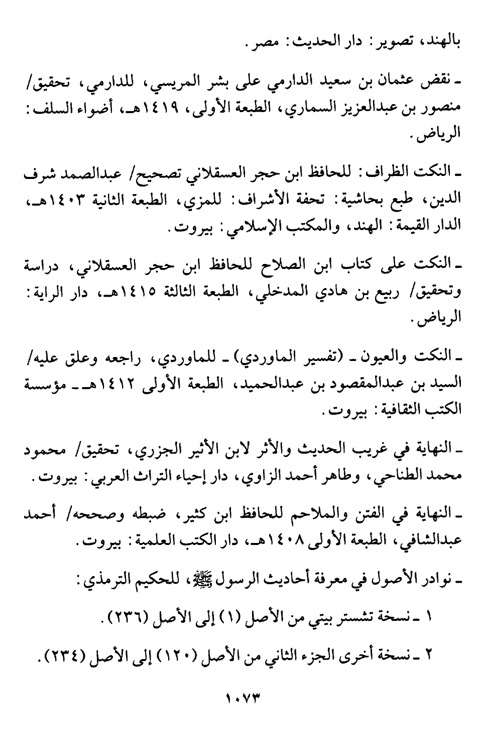 - النكت على كتاب ابن الصلاح للحافظ ابن حجر العسقلاني، دراسة وتحقيق/ ربيع بن هادي المدخلي، الطبعة الثالثة ١٤١٥ هـ، دار الراية: الرياض.