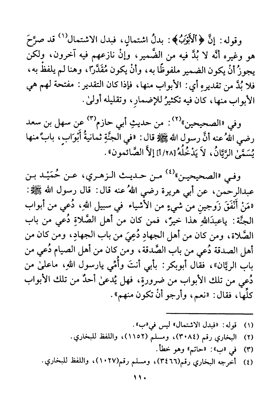 وقوله: إنَّ {الْأَبْوَابُ}: بدلُ اشتمالٍ، فبدل الاشتمال (¬١) قد صرَّحَ هو وغيره أنَّه لا بُدَّ فيه من الضَّمير، وإنْ نازعهم فيه آخرون، ولكن يجوزُ أنْ يكون الضمير ملفوظًا به، وأنْ يكون مُقَدَّرًا، وهنا لم يلفظْ به، فلا بُدَّ من تقديرهِ أي: الأبواب منها، فإذا كان التقدير: مفتحة لهم هي الأبواب منها، كان فيه تكثيرُ للإضمارِ، وتقليله أولى.