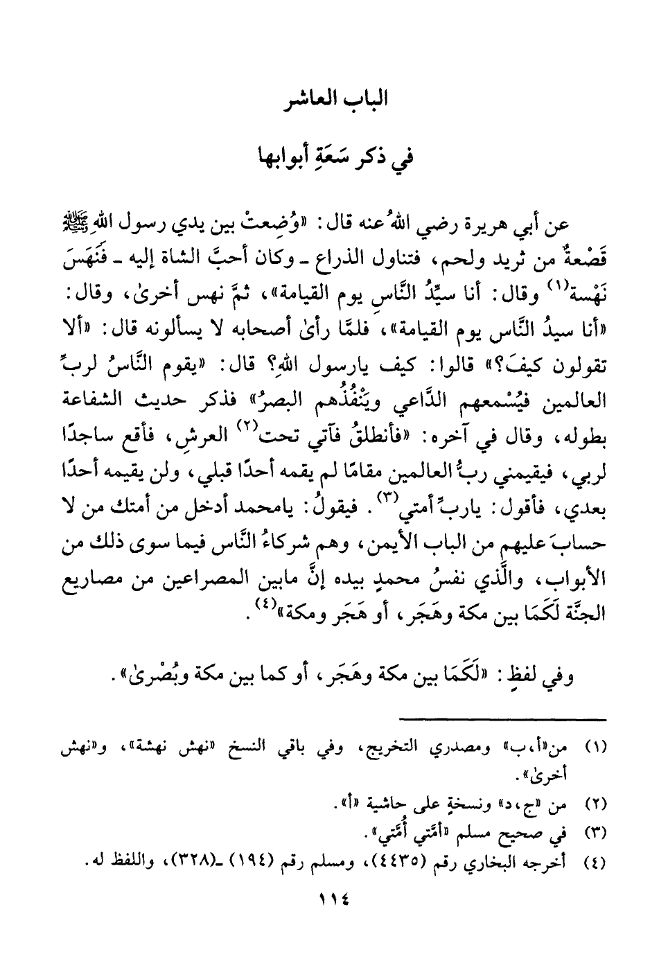 عن أبي هريرة رضي اللَّهُ عنه قال: "وُضِعتْ بين يدي رسول اللَّهِ -صلى اللَّه عليه وسلم- قَصْعةٌ من ثريد ولحم، فتناول الذراع -وكان أحبَّ الشاة إليه- فَنَهَسَ نَهْسة (¬١) وقال: أنا سيِّدُ النَّاسِ يوم القيامة"، ثمَّ نهس أخرى، وقال: "أنا سيدُ النَّاس يوم القيامة"، فلمَّا رأى أصحابه لا يسألونه قال: "ألا تقولون كيفَ؟ " قالوا: كيف يا رسول اللَّهِ؟ قال: "يقوم النَّاسُ لربِّ العالمين فيُسْمعهم الدَّاعي ويَنْفُذُهم البصرُ" فذكر حديث الشفاعة بطوله، وقال في آخره: "فأنطلقُ فآتي تحت (¬٢) العرشِ، فأقع ساجدًا لربي، فيقيمني ربُّ العالمين مقامًا لم يقمه أحدًا قبلي، ولن يقيمه أحدًا بعدي، فأقول: يا ربِّ أمتي (¬٣). فيقولُ: يا محمد أدخل من أمتك من لا حسابَ عليهم من الباب الأيمن، وهم شركاءُ النَّاس فيما سوى ذلك من الأبواب، والَّذي نفسُ محمدٍ بيده إنَّ ما بين المصراعين من مصاريع الجنَّة لَكَمَا بين مكة وهَجَر، أو هَجَر ومكة" (¬٤).