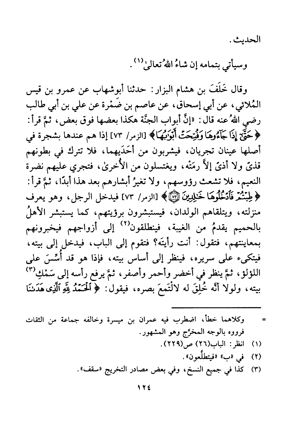 وقال خَلَفَ بن هشام البزار: حدثنا أبو شهاب عن عمرو بن قيس المُلائي، عن أبي إسحاق، عن عاصم بن ضَمْرة عن علي بن أبي طالب رضي اللَّهُ عنه قال: "إنَّ أبواب الجنَّة هكذا بعضها فوق بعض، ثمَّ قرأ: {حَتَّى إِذَا جَاءُوهَا وَفُتِحَتْ أَبْوَابُهَا} [الزمر: ٧٣] إذا هم عندها بشجرة في أصلها عينان تجريان، فيشربون من أحَدَيهما، فلا تترك في بطونهم قذًى ولا أذًى إلَّا رمَتْه، ويغتسلون من الأُخرى، فتجري عليهم نضرة النعيم، فلا تشعث رؤوسهم، ولا تغيرُ أبشارهم بعد هذا أبدًا، ثمَّ قرأ: {طِبْتُمْ فَادْخُلُوهَا خَالِدِينَ (٧٣) } [الزمر: ٧٣] فيدخل الرجل، وهو يعرف منزلته، ويتلقاهم الولدان، فيستبشرون برؤيتهم، كما يستبشر الأهلُ بالحميم يقدمُ من الغيبة، فينطلقون (¬٢) إلى أزواجهم فيخبرونهم بمعاينتهم، فتقول: أنت رأيتَه؟ فتقوم إلى الباب، فيدخل إلى بيته، فيتكئ على سريره، فينظر إلى أساس بيته، فإذا هو قد أُسِّسَ على اللؤلؤ، ثمَّ ينظر في أخضر وأحمر وأصفر، ثمَّ يرفع رأسه إلى سَمْكِ (¬٣) بيته، ولولا أنَّه خُلِقَ له لالْتَمعَ بصره، فيقول: {الْحَمْدُ لِلَّهِ الَّذِي هَدَانَا