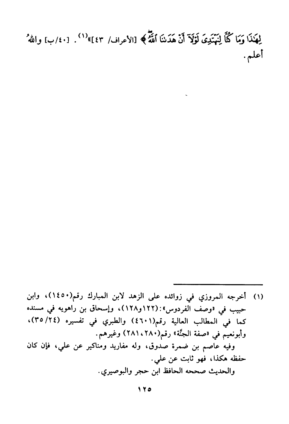 (¬١) أخرجه المروزي في زوائده على الزهد لابن المبارك رقم (١٤٥٠)، وابن حبيب في "وصف الفردوس": (١٢٢ و ١٢٨)، وإسحاق بن راهويه في مسنده كما في المطالب العالية رقم (٤٦٠١) والطبري في تفسيره (٢٤/ ٣٥)، وأبو نعيم في "صفة الجنَّة" رقم (٢٨٠، ٢٨١) وغيرهم.