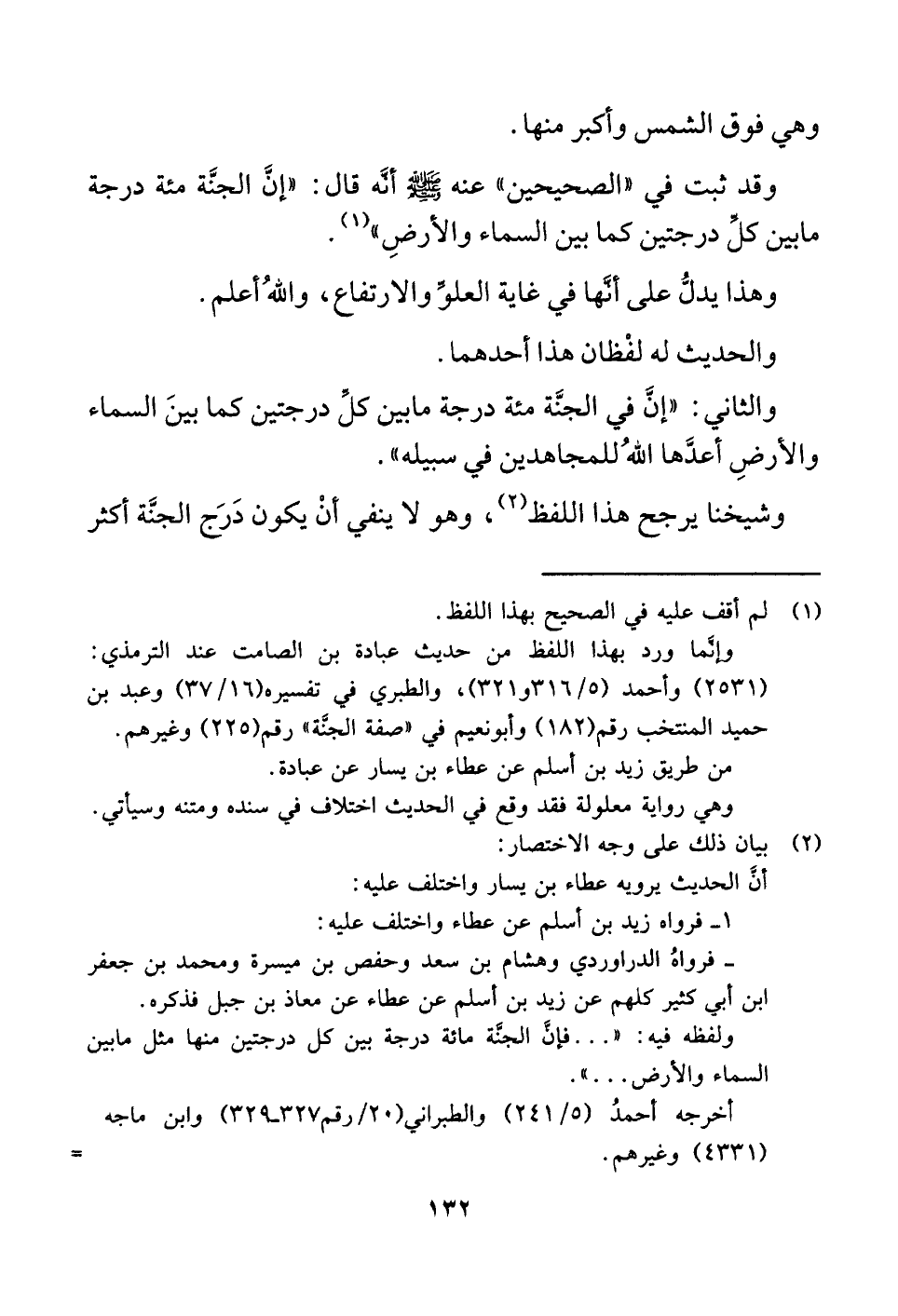 والثاني: "إنَّ في الجنَّة مئة درجة ما بين كلِّ درجتين كما بينَ السماء والأرضِ أعدَّها اللَّهُ للمجاهدين في سبيله".