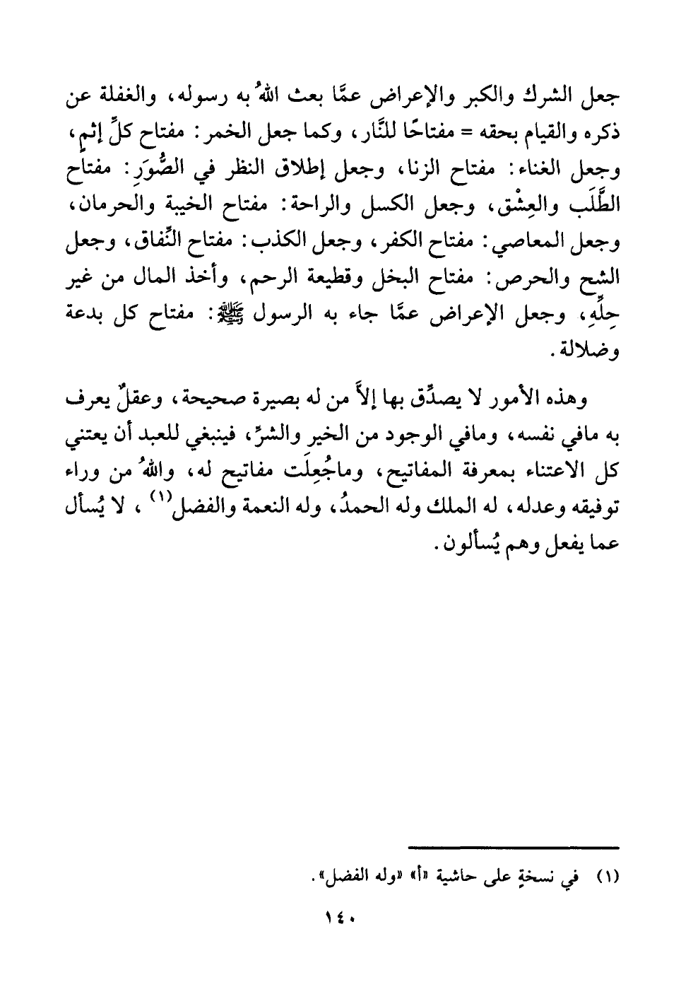وهذه الأمور لا يصدِّق بها إلَّا من له بصيرة صحيحة، وعقلٌ يعرف به ما في نفسه، وما في الوجود من الخير والشرِّ، فينبغي للعبد أن يعتني كل الاعتناء بمعرفة المفاتيح، وما جُعِلَت مفاتيح له، واللَّهُ من وراء توفيقه وعدله، له الملك وله الحمدُ، وله النعمة والفضل (¬١) ، لا يُسأل عما يفعل وهم يُسألون.
