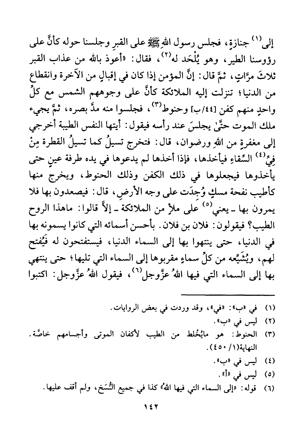 إلى (¬١) جنازةٍ، فجلس رسول اللَّهِ -صلى اللَّه عليه وسلم- على القبرِ وجلسنا حوله كأنَّ على رؤوسنا الطير، وهو يُلْحَد له (¬٢) ، فقال: "أعوذ باللَّه من عذاب القبر ثلاثَ مرَّاتٍ، ثمَّ قال: إنَّ المؤمن إذا كان في إقبالٍ من الآخرة وانقطاع من الدنيا؛ تنزلت إليه الملائكة كأنَّ على وجوههم الشمس مع كلِّ واحدٍ منهم كفن وحنوط (¬٣) ، فجلسوا منه مدَّ بصره، ثمَّ يجيء ملك الموت حتَّى يجلسَ عند رأسه فيقول: أيتها النفس الطيبة أخرجي إلى مغفرةٍ من اللَّهِ ورضوان، قال: فتخرج تسيلُ كما تسيلُ القطرة مِنْ فِيِّ (¬٤) السِّقاءِ فيأخذها، فإذا أخذها لم يدعوها في يده طرفة عينٍ حتى يأخذوها فيجعلوها في ذلك الكفن وذلك الحنوط، ويخرج منها كأطيب نفحة مسكٍ وُجدَت على وجه الأرضِ، قال: فيصعدون بها فلا يمرون بها -يعني (¬٥) عَلى ملأٍ من الملائكة- إلَّا قالوا: ما هذا الروح الطيب؟ فيقولون: فلان بن فلان. بأحسن أسمائه التي كانوا يسمونه بها في الدنيا، حتى ينتهوا بها إلى السماء الدنيا، فيستفتحون له فيُفتح لهم، ويُشَيِّعه من كلِّ سماءٍ مقربوها إلى السماء التي تليها؛ حتى ينتهي بها إلى السماء التي فيها اللَّهُ عزَّ وجل (¬٦) ، فيقول اللَّهُ عزَّ وجل: اكتبوا