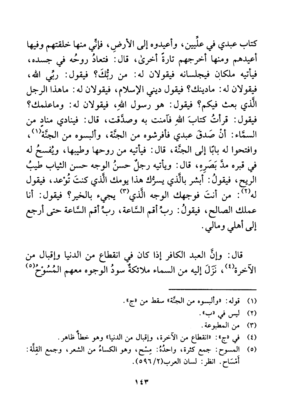 كتاب عبدي في علِّيين، وأعيدوه إلى الأرضِ، فإنِّي منها خلقتهم وفيها أعيدهم ومنها أخرجهم تارةً أخرى، قال: فتعادُ روحُه في جسده، فيأتيه ملكان فيجلسانه فيقولان له: من ربُّكَ؟ فيقول: ربِّي اللَّه، فيقولان له: ما دينك؟ فيقول ديني الإسلام، فيقولان له: ما هذا الرجل الَّذي بعث فيكم؟ فيقول: هو رسول اللَّهِ، فيقولان له: وما علمك؟ فيقول: قرأتُ كتابَ اللَّهِ فآمنت به وصدَّقت، قال: فينادي منادٍ من السمَّاء: أنْ صَدقَ عبدي فأفرشوه من الجنَّة، وألبسوه من الجنَّة (¬١) ، وافتحوا له بابًا إلى الجنَّة، قال: فيأتيه من روحها وطيبها، ويُفسحُ له في قبره مدَّ بَصَرِهِ، قال: ويأتيه رجلٌ حسنُ الوجه حسن الثياب طيبُ الريح، فيقولُ: أبشر بالَّذي يسرُّك هذا يومك الَّذي كنتَ تُوْعد، فيقول له (¬٢) : من أنتَ فوجهك الوجه الَّذي (¬٣) يجيء بالخير؟ فيقول: أنا عملك الصالح، فيقولُ: ربِّ أقم السَّاعة، ربِّ أقم السَّاعة حتى أرجع إلى أهلي ومالي.
