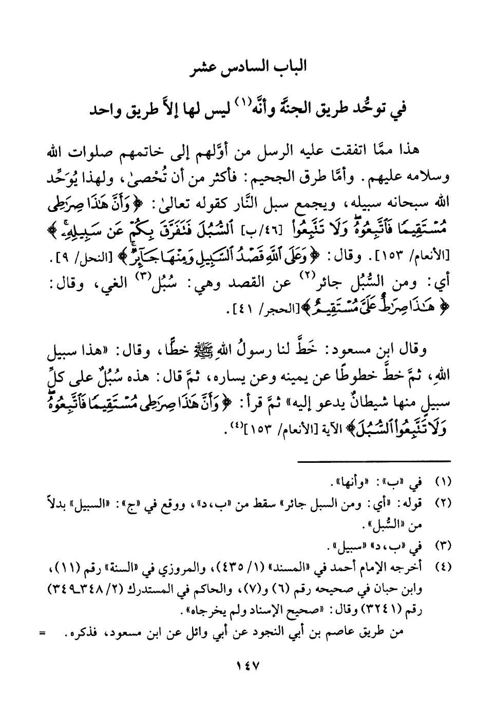 وقال ابن مسعود: خَطَّ لنا رسولُ اللَّهِ -صلى اللَّه عليه وسلم- خطًّا، وقال: "هذا سبيل اللَّهِ، ثمَّ خطَّ خطوطًا عن يمينه وعن يساره، ثمَّ قال: هذه سُبُلٌ على كلِّ سبيلٍ منها شيطانٌ يدعو إليه" ثمَّ قرأ: {وَأَنَّ هَذَا صِرَاطِي مُسْتَقِيمًا فَاتَّبِعُوهُ وَلَا تَتَّبِعُوا السُّبُلَ} الآية [الأنعام: ١٥٣] (¬٤).