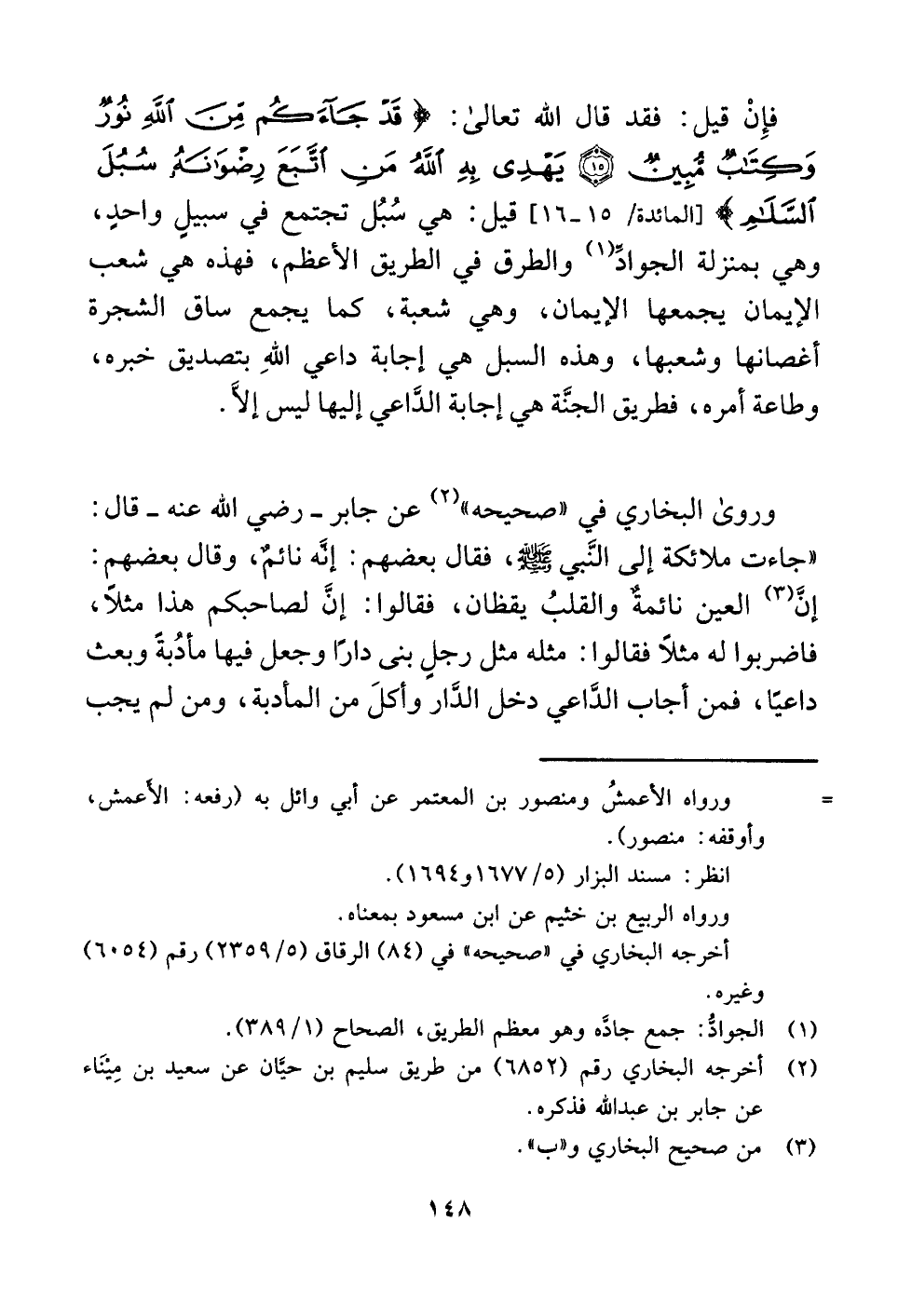 فإِنْ قيل: فقد قال اللَّه تعالى: {قَدْ جَاءَكُمْ مِنَ اللَّهِ نُورٌ وَكِتَابٌ مُبِينٌ (١٥) يَهْدِي بِهِ اللَّهُ مَنِ اتَّبَعَ رِضْوَانَهُ سُبُلَ السَّلَامِ} [المائدة: ١٥ - ١٦] قيل: هي سُبُل تجتمع في سبيلٍ واحدٍ، وهي بمنزلة الجوادِّ (¬١) والطرق في الطريق الأعظم، فهذه هي شعب الإيمان يجمعها الإيمان، وهي شعبة، كما يجمع ساق الشجرة أغصانها وشعبها، وهذه السبل هي إجابة داعي اللَّهِ بتصديق خبره، وطاعة أمره، فطريق الجنَّة هي إجابة الدَّاعي إليها ليس إلَّا.