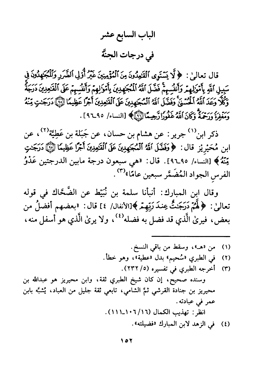 ذكر ابن (¬١) جرير: عن هشام بن حسان، عن جَبَلة بن عَطِيَّة (¬٢)، عن ابن مُحَيْرِيْز قال: {وَفَضَّلَ اللَّهُ الْمُجَاهِدِينَ عَلَى الْقَاعِدِينَ أَجْرًا عَظِيمًا (٩٥) دَرَجَاتٍ مِنْهُ} [النساء: ٩٥, ٩٦]. قال: "هي سبعون درجة ما بين الدرجتين عَدْوُ الفرسِ الجواد المُضَمَّر سبعين عامًا" (¬٣).