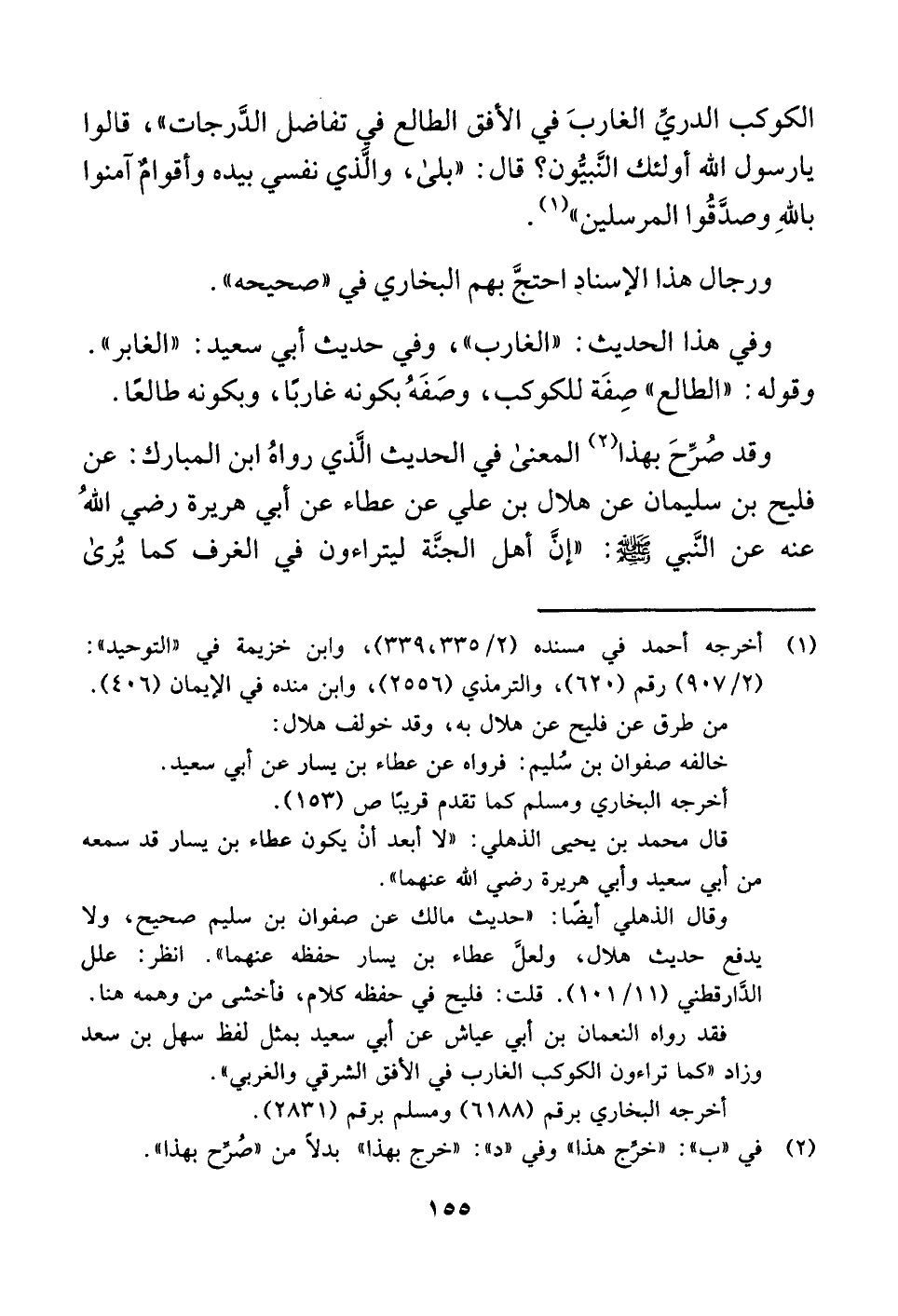 وقد صُرِّحَ بهذا (¬٢) المعنى في الحديث الَّذي رواهُ ابن المبارك: عن فليح بن سليمان عن هلال بن علي عن عطاء عن أبي هريرة رضي اللَّهُ عنه عن النَّبي -صلى اللَّه عليه وسلم-: "إنَّ أهل الجنَّة ليتراءون في الغرف كما يُرى