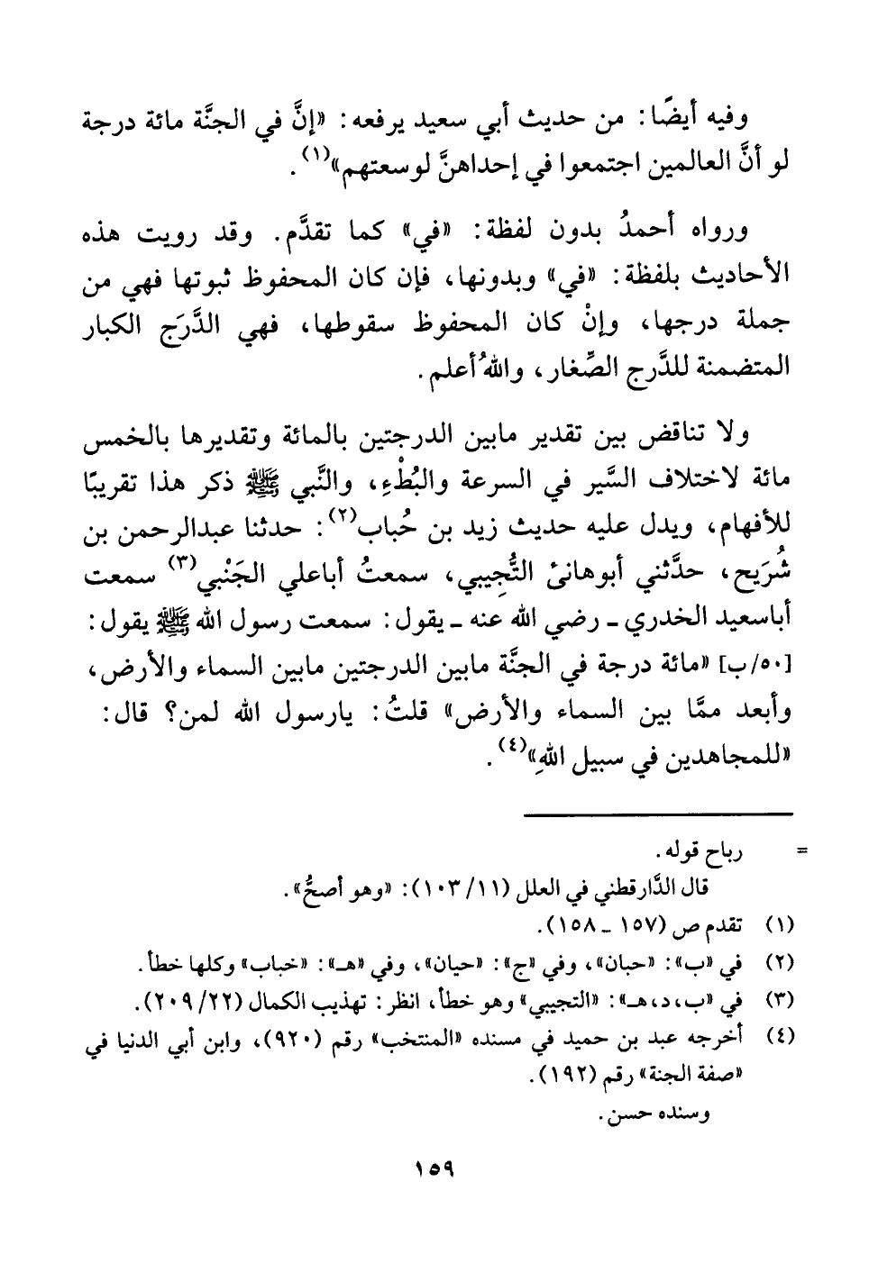 ولا تناقض بين تقدير ما بين الدرجتين بالمائة وتقديرها بالخمس مائة لاختلاف السَّير في السرعة والبُطْءِ، والنَّبي -صلى اللَّه عليه وسلم- ذكر هذا تقريبًا للأفهام، ويدل عليه حديث زيد بن حُباب (¬٢) : حدثنا عبد الرحمن بن شُرَيح، حدَّثني أبو هانئ التُّجِيبي، سمعتُ أبا علي الجَنْبي (¬٣) سمعت أبا سعيد الخدري -رضي اللَّه عنه- يقول: سمعت رسول اللَّه -صلى اللَّه عليه وسلم- يقول: "مائة درجة في الجنَّة ما بين الدرجتين ما بين السماء والأرض، وأبعد ممَّا بين السماء والأرض" قلتُ: يا رسول اللَّه لمن؟ قال: "للمجاهدين في سبيل اللَّهِ" (¬٤) .