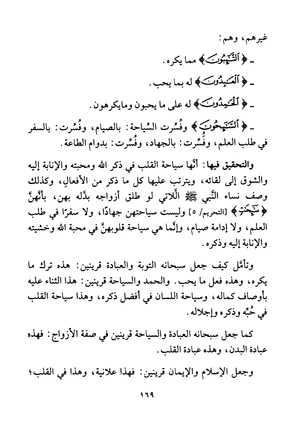 والتحقيق فيها: أنَّها سياحة القلب في ذكر اللَّه ومحبته والإنابة إليه والشوق إلى لقائه، ويترتب عليها كل ما ذكر من الأفعالِ، وكذلك وصف نساء النَّبي -صلى اللَّه عليه وسلم- الَّلاتي لو طلق أزواجه بدَّله بهن، بأنَّهنَّ {سَائِحَاتٍ} [التحريم: ٥] وليست سياحتهن جهادًا، ولا سفرًا في طلب العلم، ولا إدامة صيام، وإنَّما هي سياحة قلوبهنَّ في محبة اللَّه وخشيته والإنابة إليه وذكره.