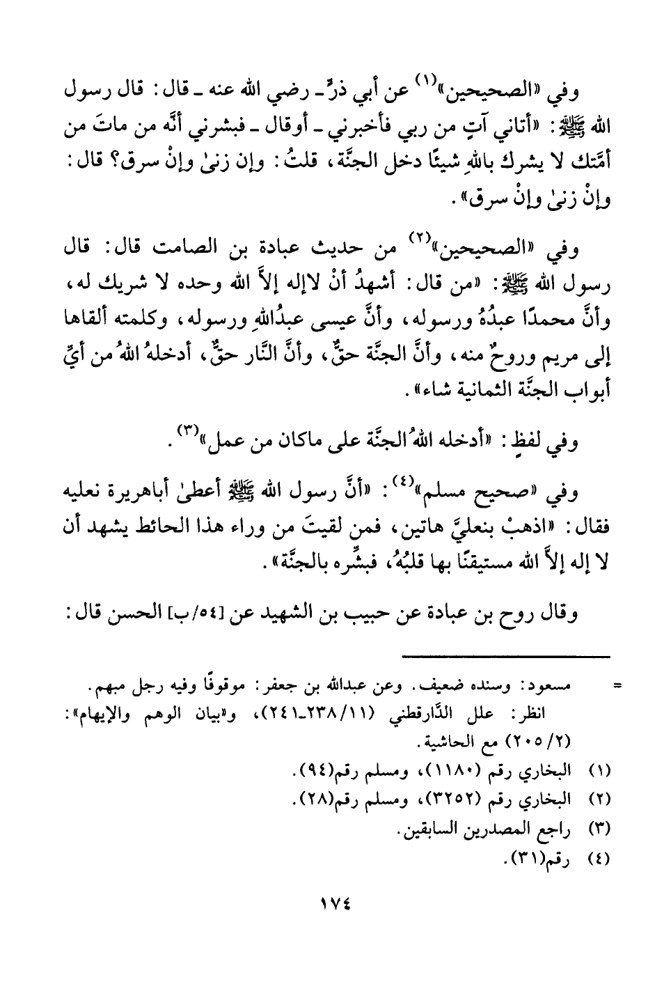 وفي "صحيح مسلم" (¬٤) : "أنَّ رسول اللَّه -صلى اللَّه عليه وسلم- أعطى أبا هريرة نعليه فقال: "اذهبْ بنعليَّ هاتين، فمن لقيتَ من وراء هذا الحائط يشهد أن لا إله إلَّا اللَّه مستيقنًا بها قلبُهُ، فبشِّره بالجنَّة".
