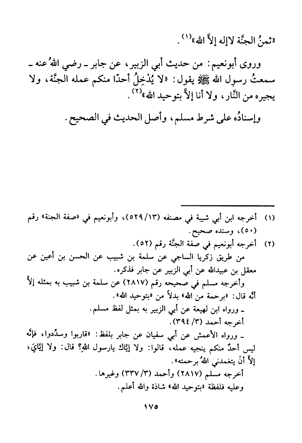 وروى أبو نعيم: من حديث أبي الزبير، عن جابر - رضي اللَّهُ عنه - سمعتُ رسول اللَّه -صلى اللَّه عليه وسلم- يقول: "لا يُدْخِلُ أحدًا منكم عمله الجنَّة، ولا يجيره من النَّار، ولا أنا إلَّا بتوحيد اللَّه" (¬٢) .