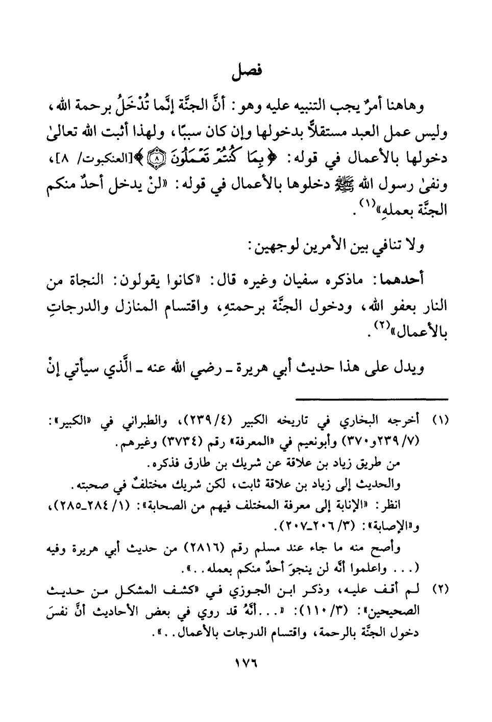 أحدهما: ما ذكره سفيان وغيره قال: "كانوا يقولون: النجاة من النار بعفو اللَّه، ودخول الجنَّة برحمتهِ، واقتسام المنازل والدرجاتِ بالأعمال" (¬٢).