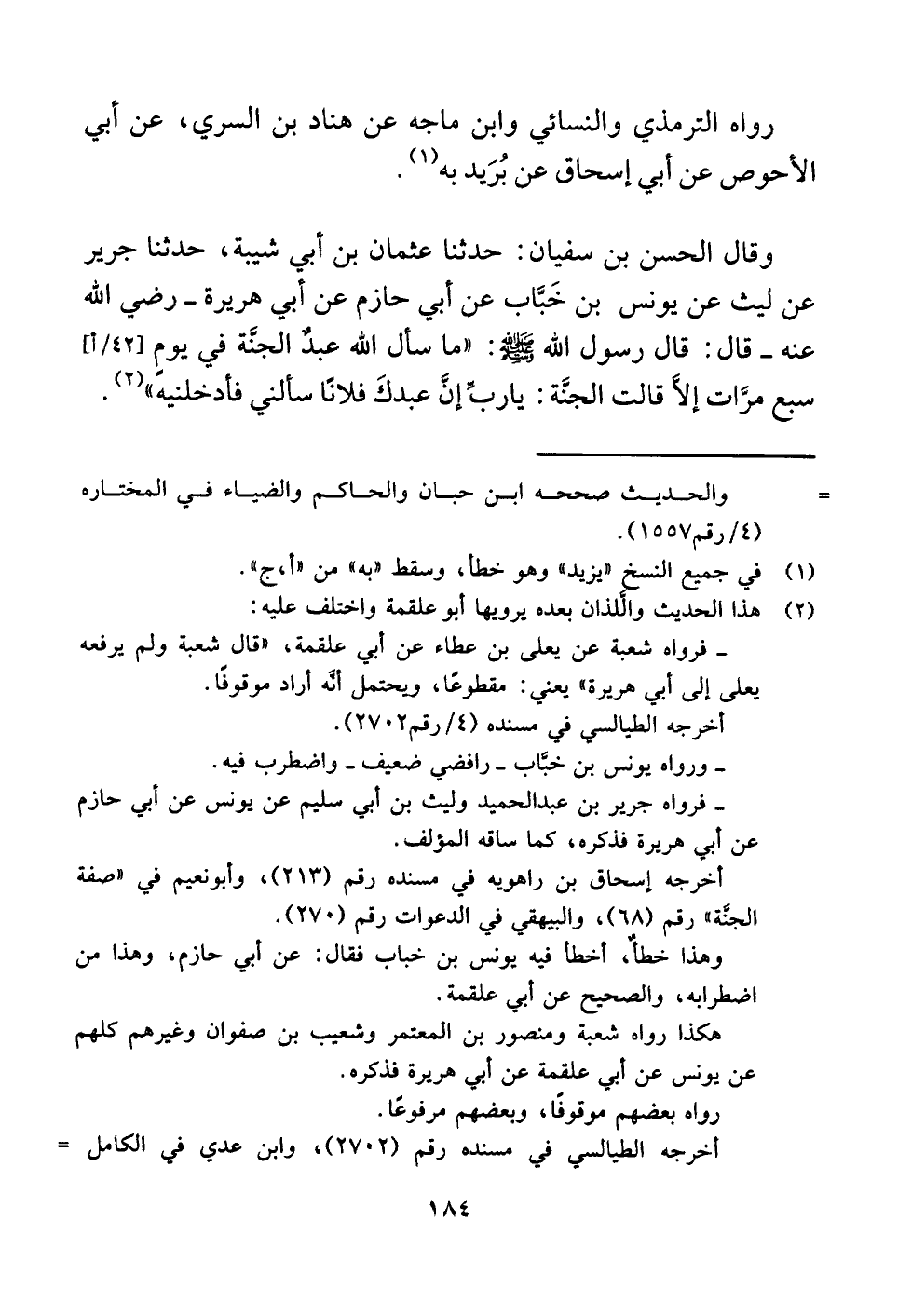 وقال الحسن بن سفيان: حدثنا عثمان بن أبي شيبة، حدثنا جرير عن ليث عن يونس بن خَبَّاب عن أبي حازم عن أبي هريرة -رضي اللَّه عنه- قال: قال رسول اللَّه -صلى اللَّه عليه وسلم-: "ما سأل اللَّه عبدٌ الجنَّة في يومٍ سبع مرَّات إلَّا قالت الجنَّة: يا ربِّ إنَّ عبدكَ فلانًا سألني فأدخلنيه" (¬٢) .