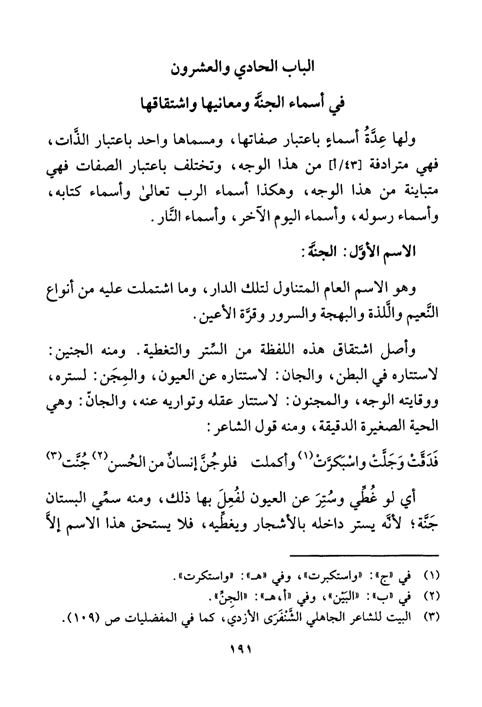 الباب الحادي والعشرون في أسماء الجنَّة ومعانيها واشتقاقها