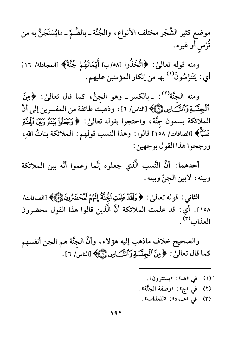 ومنه الجِنَّة (¬٢) : -بالكسر- وهو الجِنُّ، كما قال تعالى: {مِنَ الْجِنَّةِ وَالنَّاسِ (٦) } [الناس: ٦]، وذهبت طائفة من المفسرين إلى أنَّ الملائكة يسمون جِنَّة، واحتجوا بقوله تعالى: {وَجَعَلُوا بَيْنَهُ وَبَيْنَ الْجِنَّةِ نَسَبًا} [الصافات: ١٥٨] قالوا: وهذا النسب قولهم: الملائكة بناتُ اللَّهِ، ورجحوا هذا القول بوجهين: