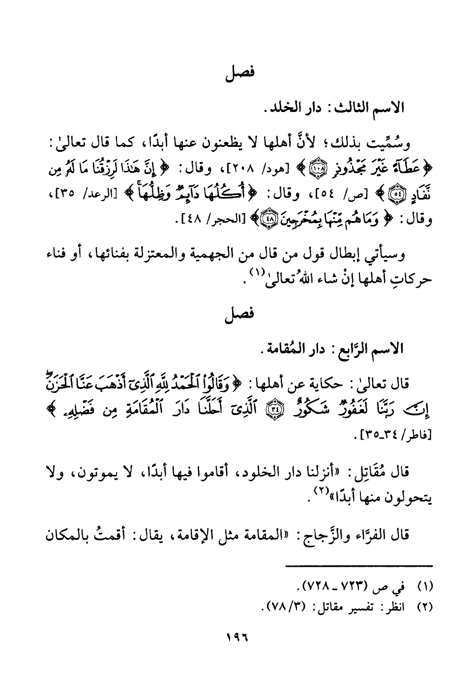وسيأتي إبطال قول من قال من الجهمية والمعتزلة بفنائها، أو فناء حركاتِ أهلها إنْ شاء اللَّهُ تعالى (¬١).