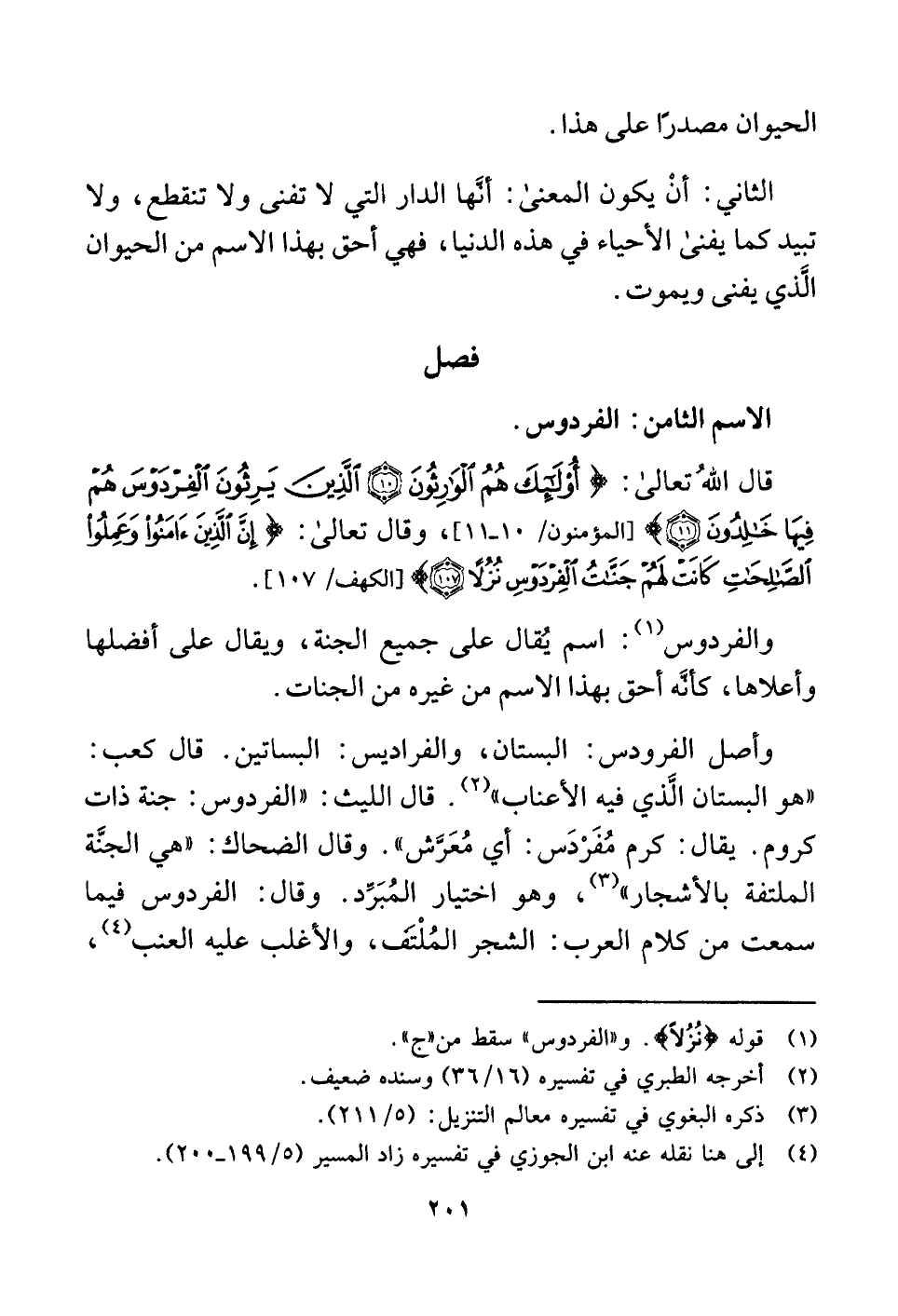 وأصل الفردوس: البستان، والفراديس: البساتين. قال كعب: "هو البستان الَّذي فيه الأعناب" (¬٢). قال الليث: "الفردوس: جنة ذات كروم. يقال: كرم مُفَرْدَس: أي مُعَرَّش". وقال الضحاك: "هي الجنَّة الملتفة بالأشجار" (¬٣)، وهو اختيار المُبَرَّد. وقال: الفردوس فيما سمعت من كلام العرب: الشجر المُلْتَف، والأغلب عليه العنب (¬٤)،