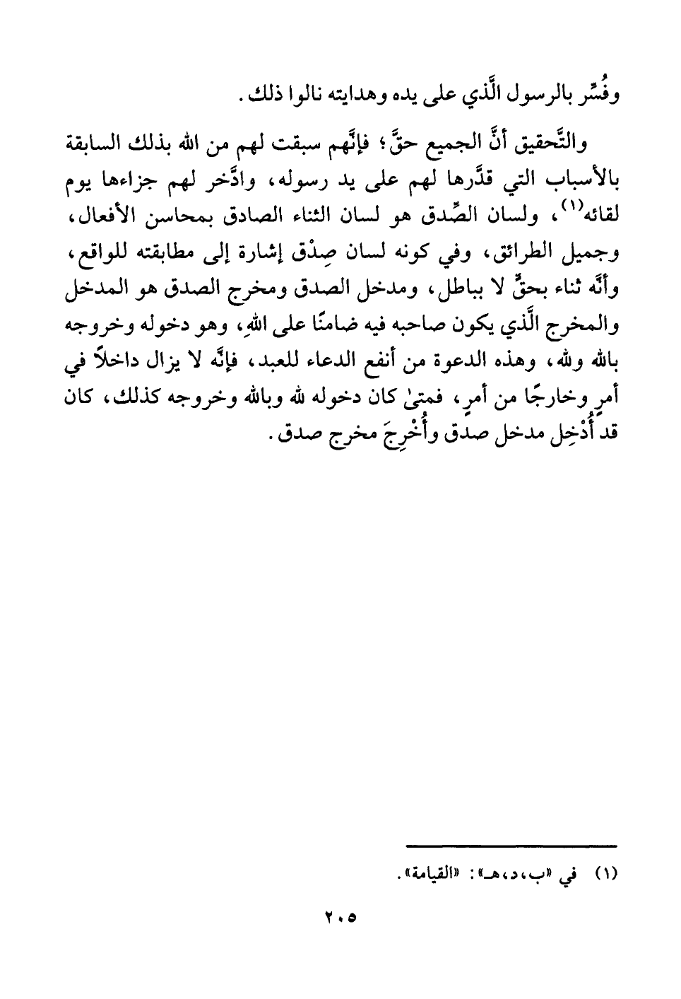 والتَّحقيق أنَّ الجميع حقَّ؛ فإنَّهم سبقت لهم من اللَّه بذلك السابقة بالأسباب التي قدَّرها لهم على يد رسوله، وادَّخر لهم جزاءها يوم لقائه (¬١) ، ولسان الصَّدق هو لسان الثناء الصادق بمحاسن الأفعال، وجميل الطرائق، وفي كونه لسان صِدْق إشارة إلى مطابقته للواقع، وأنَّه ثناء بحقًّ لا بباطل، ومدخل الصدق ومخرج الصدق هو المدخل والمخرج الَّذي يكون صاحبه فيه ضامنًا على اللَّهِ، وهو دخوله وخروجه باللَّه وللَّه، وهذه الدعوة من أنفع الدعاء للعبد، فإنَّه لا يزال داخلًا في أمرٍ وخارجًا من أمرٍ، فمتى كان دخوله للَّه وباللَّه وخروجه كذلك، كان قد أُدْخِل مدخل صدق وأُخْرِجَ مخرج صدق.