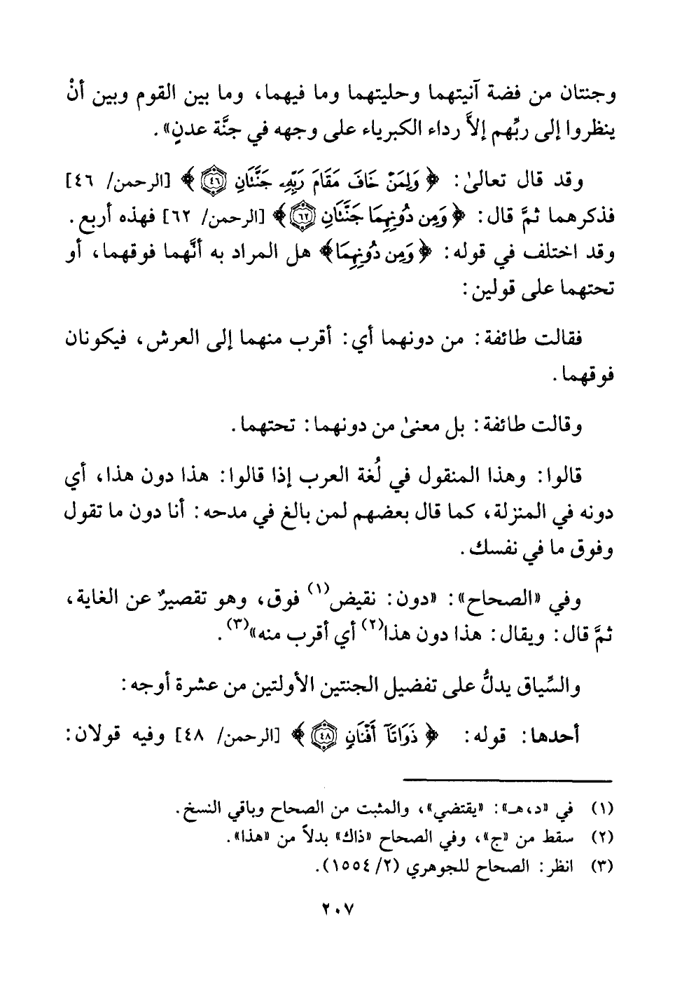 وقد قال تعالى: {وَلِمَنْ خَافَ مَقَامَ رَبِّهِ جَنَّتَانِ (٤٦) } [الرحمن: ٤٦] فذكرهما ثمَّ قال: {وَمِنْ دُونِهِمَا جَنَّتَانِ (٦٢) } [الرحمن: ٦٢] فهذه أربع. وقد اختلف في قوله: {وَمِنْ دُونِهِمَا} هل المراد به أنَّهما فوقهما، أو تحتهما على قولين: