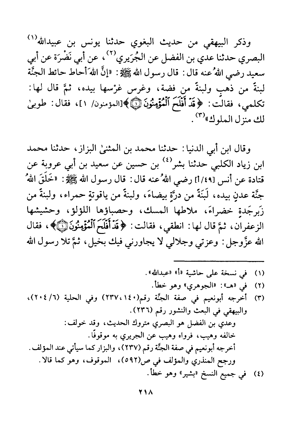 (¬٣) أخرجه أبو نعيم في صفة الجنَّة رقم (١٤٠، ٢٣٧) وفي الحلية (٦/ ٢٠٤)، والبيهقي في البعث والنشور رقم (٢٣٦).