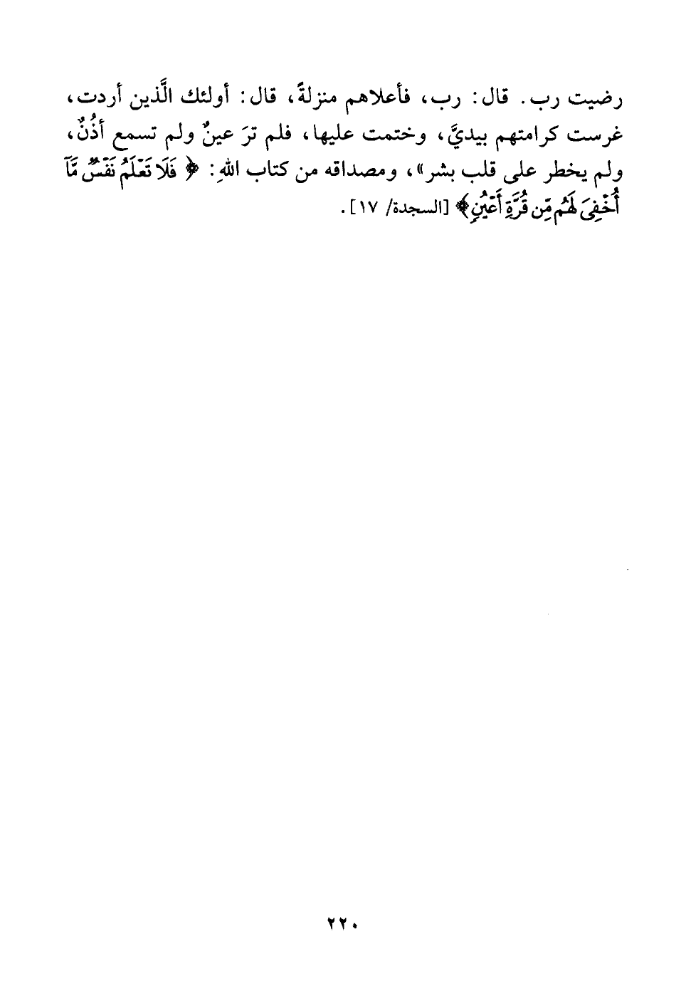 رضيت رب. قال: رب، فأعلاهم منزلةً، قال: أولئك الَّذين أردت، غرست كرامتهم بيديَّ، وختمت عليها، فلم ترَ عينٌ ولم تسمع أذُنٌ، ولم يخطر على قلب بشر"، ومصداقه من كتاب اللَّهِ: {فَلَا تَعْلَمُ نَفْسٌ مَا أُخْفِيَ لَهُمْ مِنْ قُرَّةِ أَعْيُنٍ} [السجدة: ١٧].
