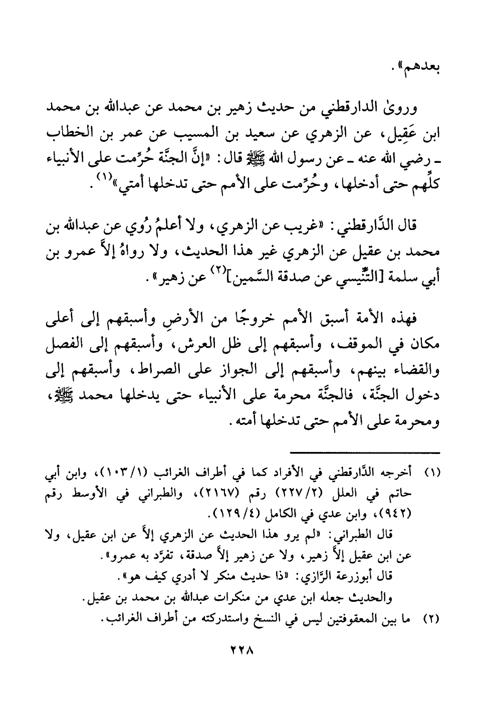 وروى الدارقطني من حديث زهير بن محمد عن عبد اللَّه بن محمد ابن عَقِيل، عن الزهري عن سعيد بن المسيب عن عمر بن الخطاب -رضي اللَّه عنه- عن رسول اللَّه -صلى اللَّه عليه وسلم- قال: "إنَّ الجنَّة حُرِّمت على الأنبياء كلَّهم حتى أدخلها، وحُرِّمت على الأمم حتى تدخلها أمتي" (¬١) .