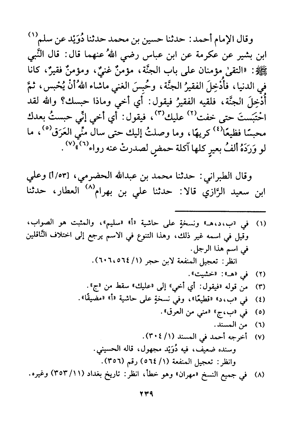 وقال الإمام أحمد: حدثنا حسين بن محمد حدثنا دُوَيْد عن سلم (¬١) ابن بشير عن عكرمة عن ابن عباس رضي اللَّهُ عنهما قال: قال النَّبي -صلى اللَّه عليه وسلم-: "التقى مؤمنان على باب الجنَّة، مؤمنٌ غنيٌ، ومؤمنٌ فقيرٌ، كانا في الدنيا، فأُدْخِلَ الفقيرُ الجنَّة، وحُبسَ الغني ما شاء اللَّهُ أنْ يُحْبس، ثمَّ أُدْخِلَ الجنَّة، فلقيه الفقيرُ فيقول: أي أخي وماذا حبسك؟ واللَّه لقد احْتبَستَ حتى خفت (¬٢) عليك (¬٣) ، فيقول: أي أخي إنِّي حبستُ بعدك محبسًا فظيعًا (¬٤) كريهًا، وما وصلتُ إليك حتى سال منِّي العَرَق (¬٥) ، ما لو وَرَدَهُ ألفُ بعيرٍ كلها آكلة حمضٍ لصدرتْ عنه رواء (¬٦) " (¬٧) .