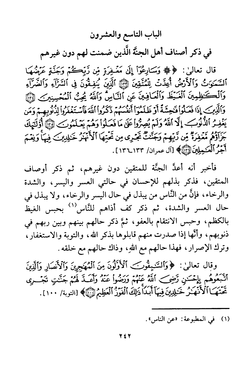 قال تعالى: {وَسَارِعُوا إِلَى مَغْفِرَةٍ مِنْ رَبِّكُمْ وَجَنَّةٍ عَرْضُهَا السَّمَاوَاتُ وَالْأَرْضُ أُعِدَّتْ لِلْمُتَّقِينَ (١٣٣) الَّذِينَ يُنْفِقُونَ فِي السَّرَّاءِ وَالضَّرَّاءِ وَالْكَاظِمِينَ الْغَيْظَ وَالْعَافِينَ عَنِ النَّاسِ وَاللَّهُ يُحِبُّ الْمُحْسِنِينَ (١٣٤) وَالَّذِينَ إِذَا فَعَلُوا فَاحِشَةً أَوْ ظَلَمُوا أَنْفُسَهُمْ ذَكَرُوا اللَّهَ فَاسْتَغْفَرُوا لِذُنُوبِهِمْ وَمَنْ يَغْفِرُ الذُّنُوبَ إِلَّا اللَّهُ وَلَمْ يُصِرُّوا عَلَى مَا فَعَلُوا وَهُمْ يَعْلَمُونَ (١٣٥) أُولَئِكَ جَزَاؤُهُمْ مَغْفِرَةٌ مِنْ رَبِّهِمْ وَجَنَّاتٌ تَجْرِي مِنْ تَحْتِهَا الْأَنْهَارُ خَالِدِينَ فِيهَا وَنِعْمَ أَجْرُ الْعَامِلِينَ (١٣٦)} [آل عمران: ١٣٣ - ١٣٦].
