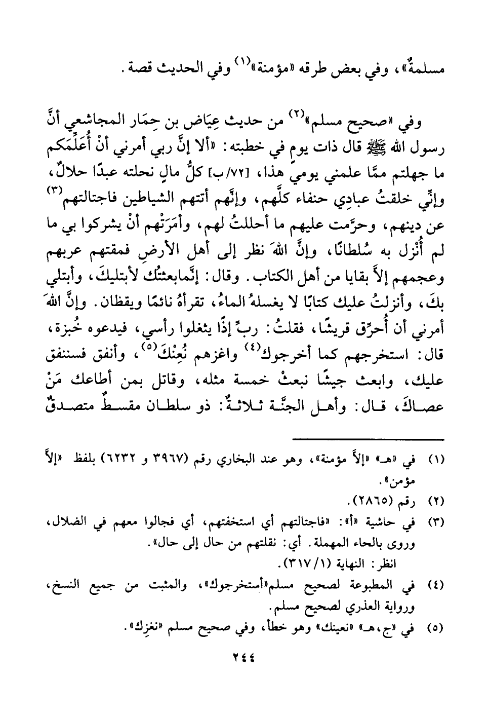 وفي "صحيح مسلم" (¬٢) من حديث عِيَاض بن حِمَار المجاشعي أنَّ رسول اللَّه -صلى اللَّه عليه وسلم- قال ذات يومٍ في خطبته: "ألا إنَّ ربي أمرني أنْ أُعَلِّمَكم ما جهلتم ممَّا علمني يومي هذا، كلُّ مالٍ نحلته عبدًا حلالٌ، وإنِّي خلقتُ عبادِي حنفاء كلَّهم، وإنَّهم أتتهم الشياطين فاجتالتهم (¬٣) عن دينهم، وحرَّمت عليهم ما أحللتُ لهم، وأمَرَتْهم أنْ يشركوا بي ما لم أُنْزل به سُلطانًا، وإنَّ اللَّهَ نظر إلى أهل الأرضِ فمقتهم عربهم وعجمهم إلَّا بقايا من أهل الكتاب. وقال: إنَّما بعثتُك لأبتليكَ، وأبتلي بكَ، وأنزلتُ عليك كتابًا لا يغسلهُ الماءُ، تقرأهُ نائمًا ويقظان. وإنَّ اللَّهَ أمرني أن أُحرَّق قريشًا، فقلتُ: ربِّ إذًا يثغلوا رأسي، فيدعوه خُبزة، قال: استخرجهم كما أخرجوك (¬٤) واغزهم نُعِنْكَ (¬٥) ، وأنفق فسننفق عليك، وابعث جيشًا نبعثْ خمسة مثله، وقاتل بمن أطاعك مَنْ عصاكَ، قال: وأهل الجنَّة ثلاثةٌ: ذو سلطان مقسطٌ متصدقٌ