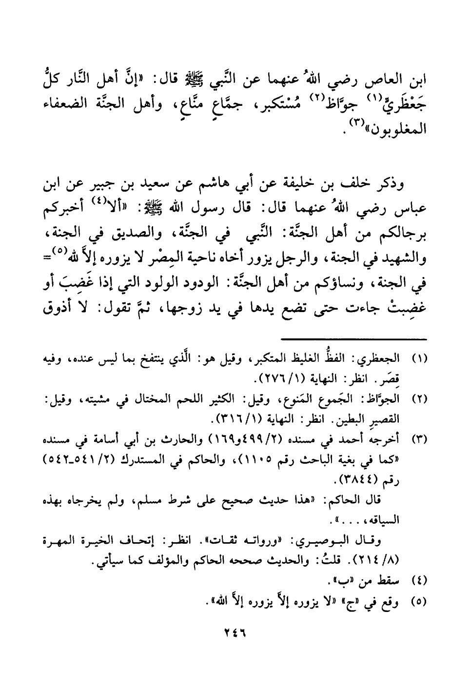 ابن العاص رضي اللَّهُ عنهما عن النَّبي -صلى اللَّه عليه وسلم- قال: "إنَّ أهل النَّار كلُّ جَعْظَريٍّ (¬١) جوَّاظ (¬٢) مُسْتَكبر، جمَّاعٍ منَّاعٍ، وأهل الجنَّة الضعفاء المغلوبون" (¬٣) .