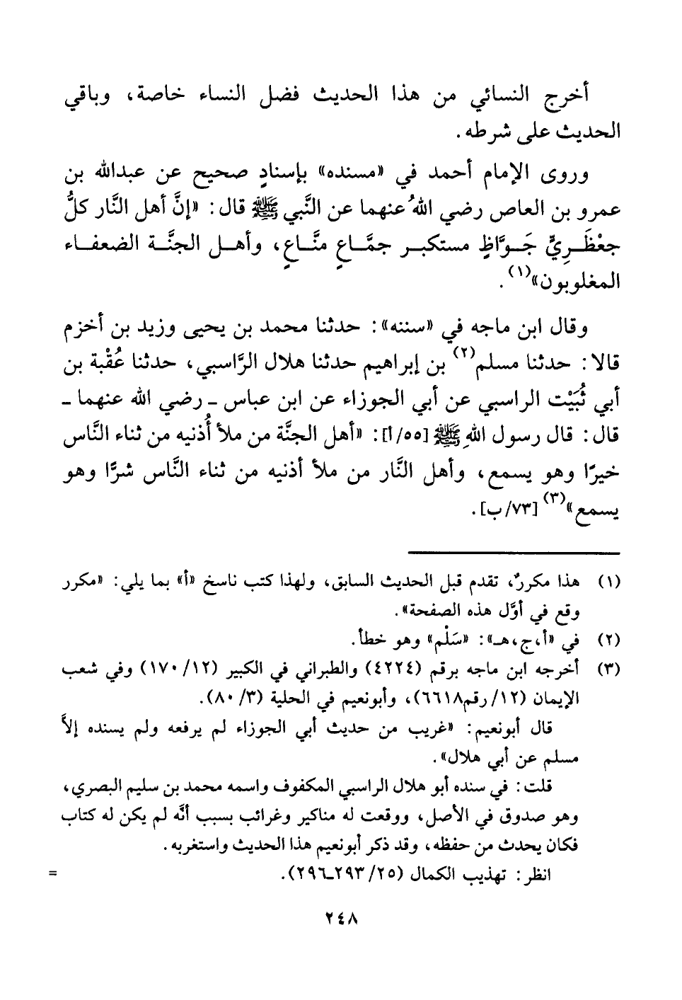 وروى الإمام أحمد في "مسنده" بإسنادٍ صحيح عن عبد اللَّه بن عمرو بن العاص رضي اللَّهُ عنهما عن النَّبي -صلى اللَّه عليه وسلم- قال: "إنَّ أهل النَّار كلُّ جعْظَرِيٍّ جَوَّاظٍ مستكبر جمَّاعٍ منَّاعٍ، وأهل الجنَّة الضعفاء المغلوبون" (¬١) .