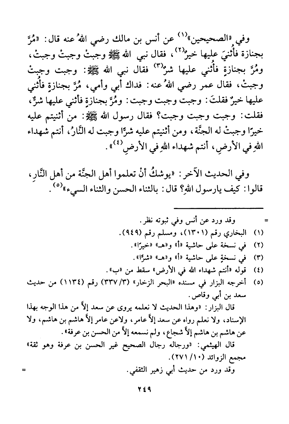 وفي "الصحيحين" (¬١) عن أنس بن مالك رضي اللَّهُ عنه قال: "مُرَّ بجنازة فأُثنيَ عليها خيرٌ (¬٢) ، فقال نبي اللَّه -صلى اللَّه عليه وسلم- وجبتْ وجبتْ وجبتْ، ومُرَّ بجنازةٍ فأُثني عليها شرٌ (¬٣) فقال نبي اللَّه -صلى اللَّه عليه وسلم-: وجبت وجبتْ وجبتْ، فقال عمر رضي اللَّهُ عنه: فداك أبي وأمي، مُرَّ بجنازةٍ فأثُني عليها خيرٌ فقلتَ: وجبت وجبت وجبت: ومُرَّ بجنازةٍ فأثني عليها شرٌّ، فقلت: وجبت وجبت وجبت؟ فقال رسول اللَّه -صلى اللَّه عليه وسلم-: من أثنيتم عليه خيرًا وجبتْ له الجنَّة، ومن أثنيتم عليه شرًّا وجبت له النَّارُ، أنتم شهداء اللَّهِ في الأرضِ، أنتم شهداء اللَّهِ في الأرضِ (¬٤) ".