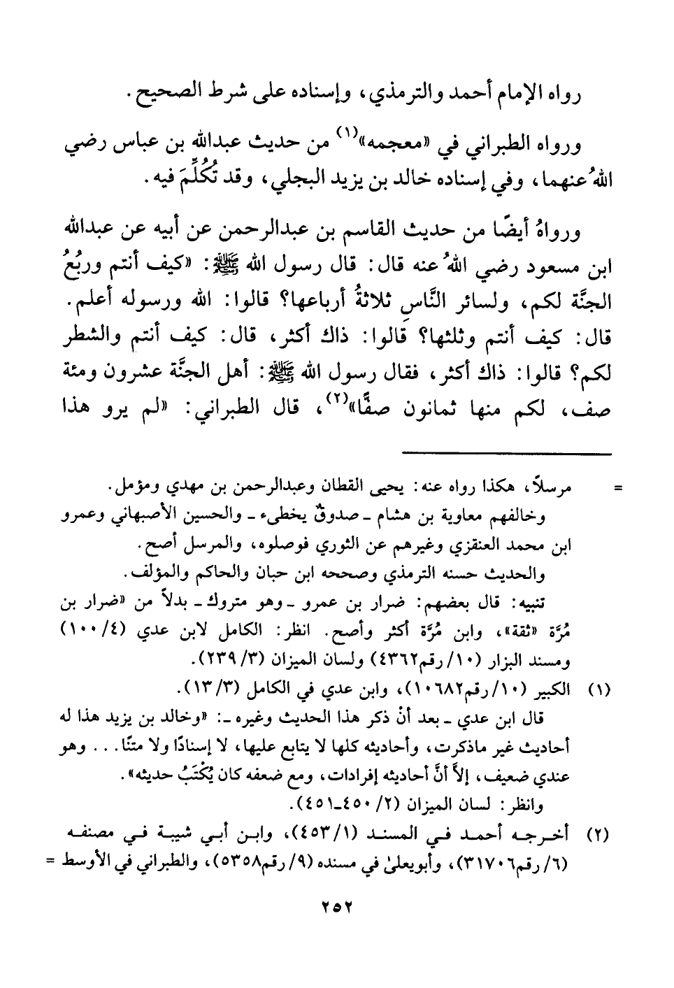 ورواهُ أيضًا من حديث القاسم بن عبد الرحمن عن أبيه عن عبد اللَّه ابن مسعود رضي اللَّهُ عنه قال: قال رسول اللَّه -صلى اللَّه عليه وسلم-: "كيف أنتم وربُعُ الجنَّة لكم، ولسائر النَّاسِ ثلاثةُ أرباعها؟ قالوا: اللَّه ورسوله أعلم. قال: كيف أنتم وثلثها؟ قالوا: ذاك أكثر، قال: كيف أنتم والشطر لكم؟ قالوا: ذاك أكثر، فقال رسول اللَّه -صلى اللَّه عليه وسلم-: أهل الجنَّة عشرون ومئة صف، لكم منها ثمانون صفًّا" (¬٢) ، قال الطبراني: "لم يرو هذا