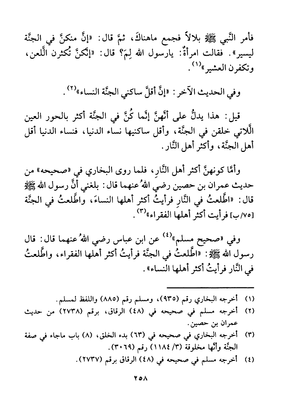 وأمَّا كونهنَّ أكثر أهل النَّارِ، فلما روى البخاري في "صحيحه" من حديث عمران بن حصين رضي اللَّهُ عنهما قال: بلغني أنَّ رسول اللَّه -صلى اللَّه عليه وسلم- قال: "اطَّلعتُ في النَّارِ فرأيتُ أكثر أهلها النساءَ، واطَّلعتُ في الجنَّة فرأيت أكثر أهلها الفقراء" (¬٣) .
