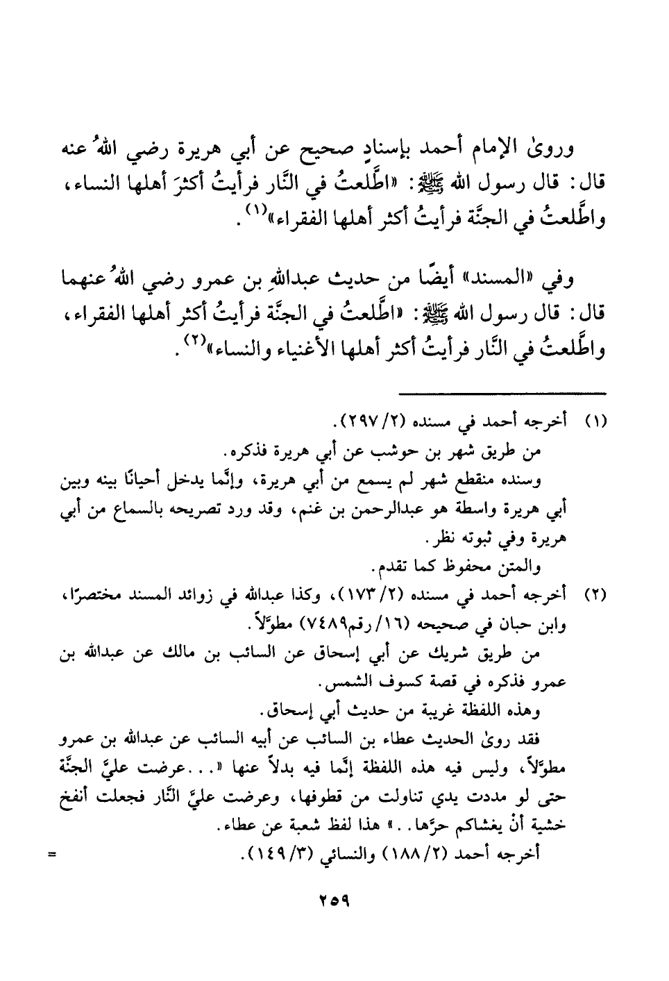 وفي "المسند" أيضًا من حديث عبد اللَّهِ بن عمرو رضي اللَّهُ عنهما قال: قال رسول اللَّه -صلى اللَّه عليه وسلم-: "اطَّلعتُ في الجنَّة فرأيتُ أكثر أهلها الفقراء، واطَّلعتُ في النَّار فرأيتُ أكثر أهلها الأغنياء والنساء" (¬٢) .