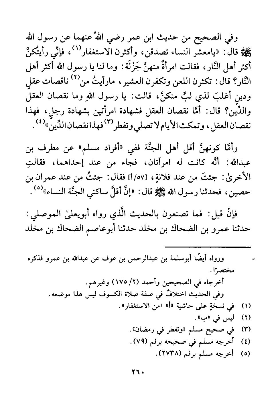 وفي الصحيح من حديث ابن عمر رضي اللَّهُ عنهما عن رسول اللَّه -صلى اللَّه عليه وسلم- قال: "يا معشر النساء تصدقن، وأكثرن الاستغفار (¬١) ، فإنِّي رأيتُكنَّ أكثر أهل النَّار، فقالت امرأةٌ منهنَّ جَزْلَة: وما لنا يا رسول اللَّه أكثر أهل النَّار؟ قال: تكثرن اللعن وتكفرن العشير، ما رأيتُ من (¬٢) ناقصات عقلٍ ودينٍ أغلبَ لذي لبٍّ منكنَّ، قالت: يا رسول اللَّهِ وما نقصان العقل والدِّين؟ قال: أمَّا نقصان العقل فشهادة امرأتين بشهادة رجلٍ، فهذا نقصان العقل، وتمكث الأيام لا تصلي وتفطر (¬٣) فهذا نقصان الدِّين" (¬٤) .