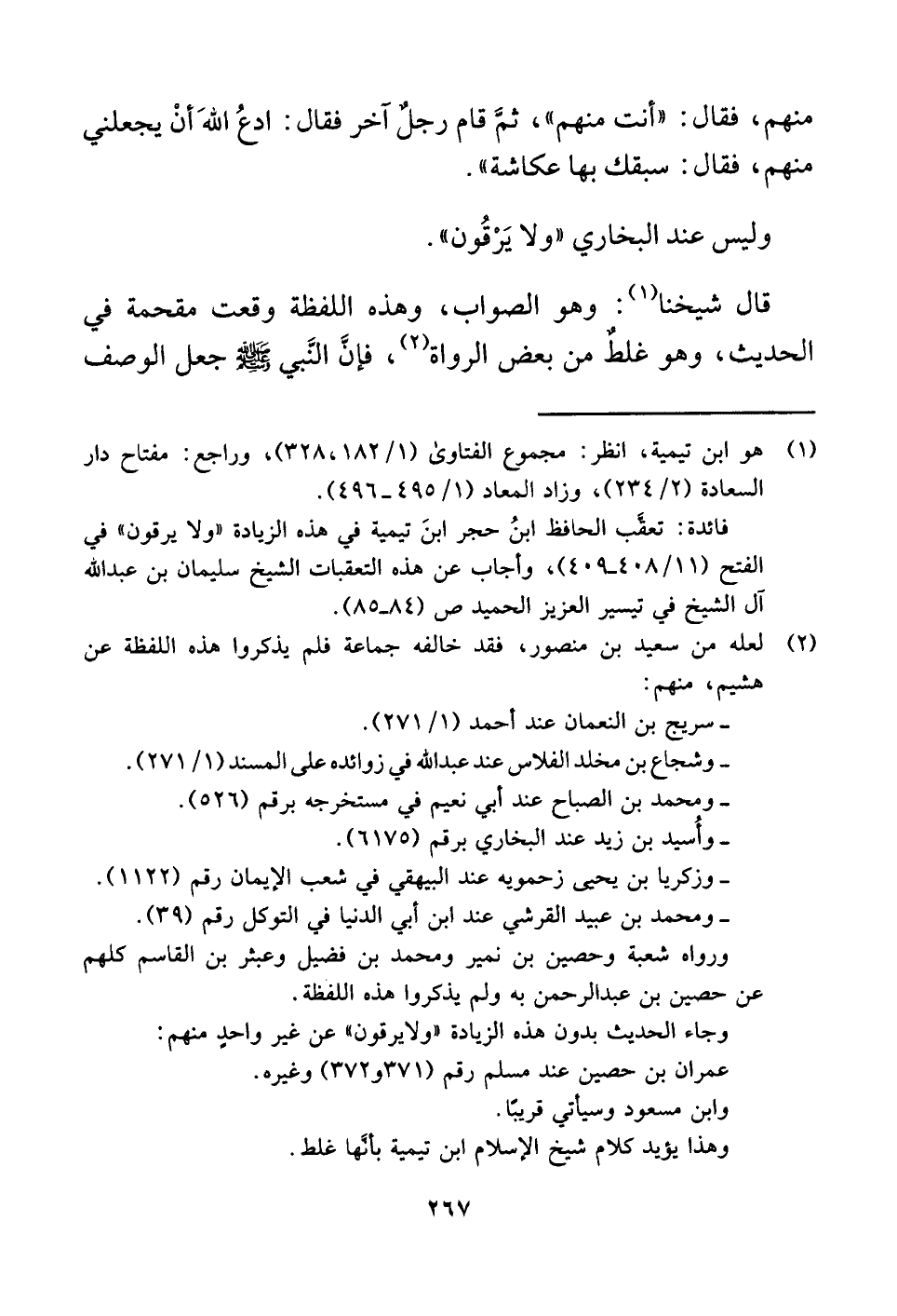فائدة: تعقَّب الحافظ ابنُ حجر ابنَ تيمية في هذه الزيادة "ولا يرقون" في الفتح (١١/ ٤٠٨ - ٤٠٩)، وأجاب عن هذه التعقبات الشيخ سليمان بن عبد اللَّه آل الشيخ في تيسير العزيز الحميد ص (٨٤ - ٨٥).