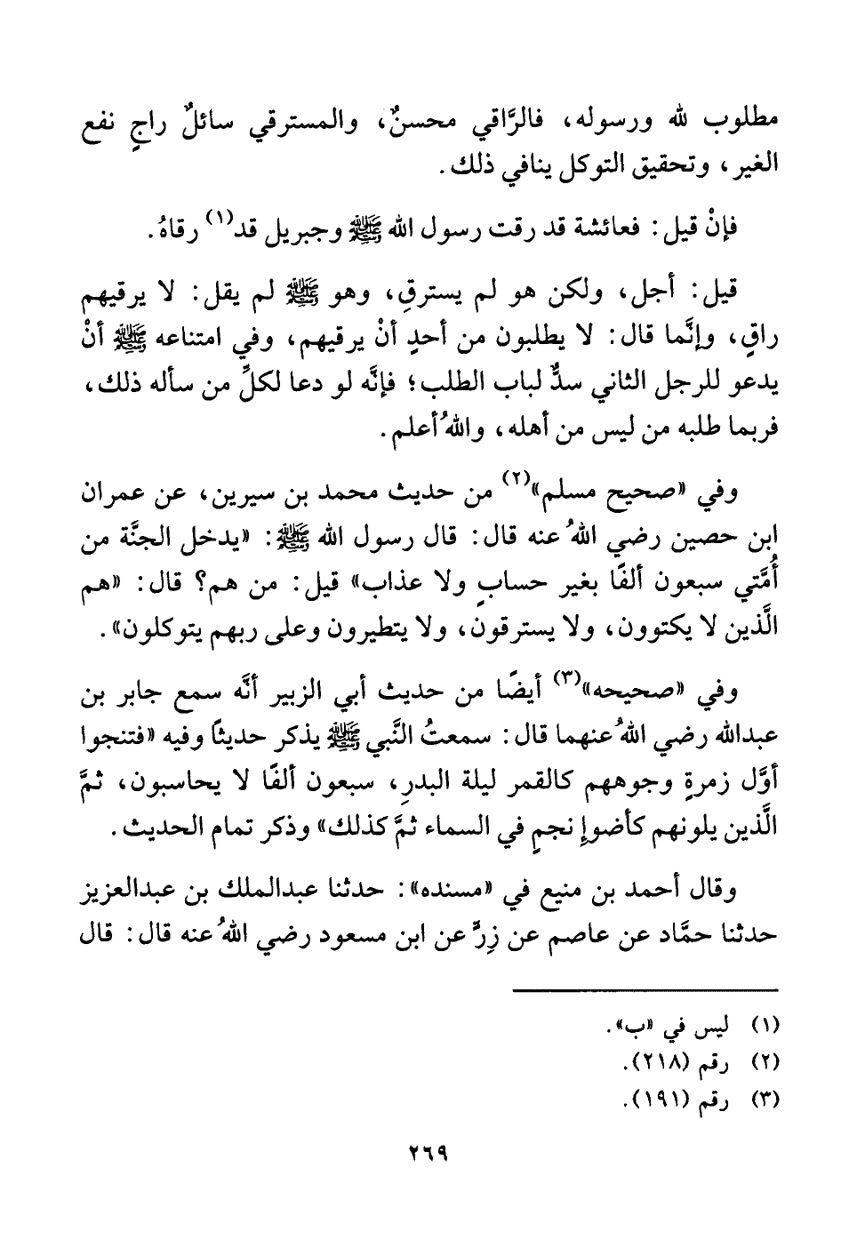 وفي "صحيح مسلم" (¬٢) من حديث محمد بن سيرين، عن عمران ابن حصين رضي اللَّهُ عنه قال: قال رسول اللَّه -صلى اللَّه عليه وسلم-: "يدخل الجنَّة من أُمَّتي سبعون ألفًا بغير حسابٍ ولا عذاب" قيل: من هم؟ قال: "هم الَّذين لا يكتوون، ولا يسترقون، ولا يتطيرون وعلى ربهم يتوكلون".