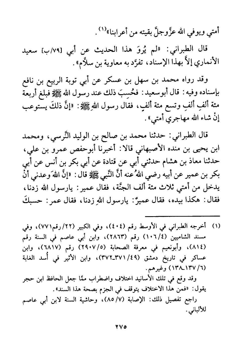 وقد رواه محمد بن سهل بن عسكر عن أبي توبة الربيع بن نافع بإسناده وفيه: قال أبو سعيد: فحُسِبَ ذلك عند رسول اللَّه -صلى اللَّه عليه وسلم- فبلغ أربعة مئة ألفِ ألفِ وتسع مئة ألفٍ، فقال رسول اللَّهِ -صلى اللَّه عليه وسلم-: "إنَّ ذلكَ يستوعب إنْ شاء اللَّه مهاجري أمتي".